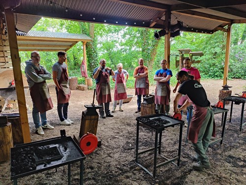 Als activiteit gingen we een écht Vikingmes smeden! Smeden, dat is poken met gloeiend heet staal, zwaaien met zware hamers en rake klappen geven. In een buitenwerkplaats ontdekten we het geheim van de middeleeuwse smid. De hitte van het smidsvuur, gerinkel van de hamers op de aambeelden en het gloeiendhete metaal vervormen met elke slag. Geen luxe schuurmachines, slijptollen of andere elektrische gereedschappen. We voelden ons echt even een stoere smid.